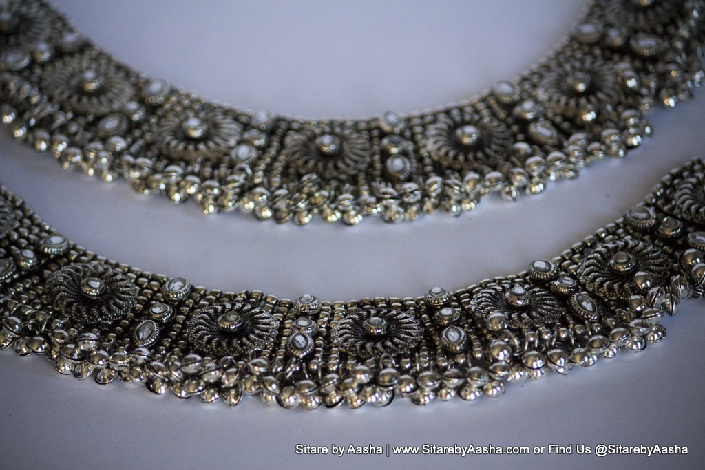 These Rajasthani style anklets will make a statement at your next occasion. Featured in gun metal with rhinestones and tiny ghungroos, these will create a tantalizing effect.